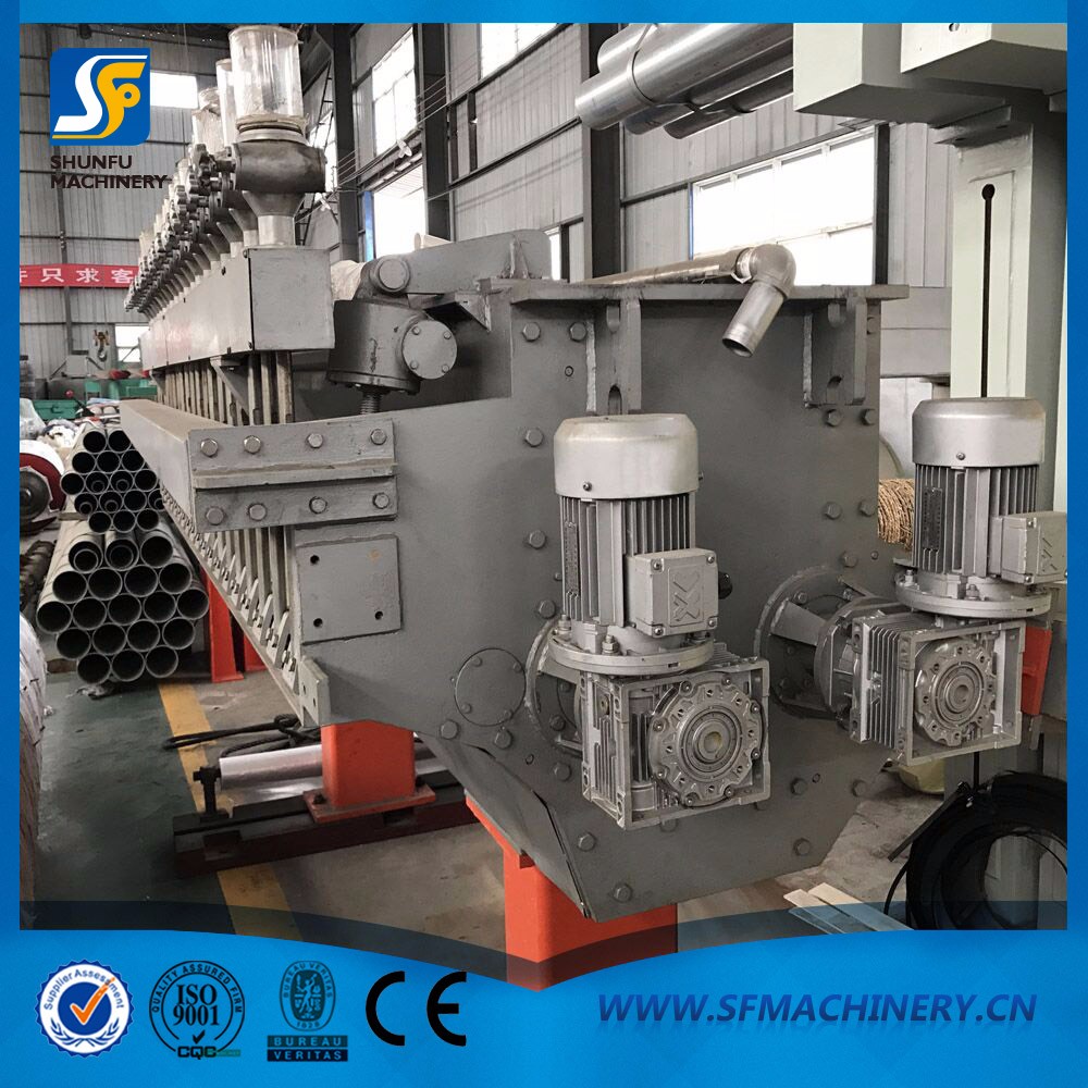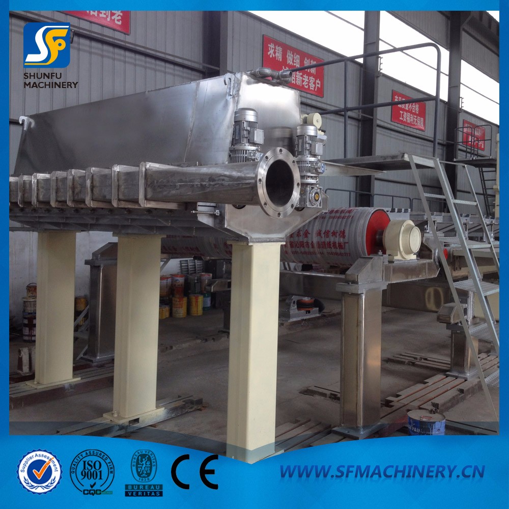 流漿箱的布漿器為方錐管總管進(jìn)漿、臺階孔板布漿。勻整裝置為二根不同開孔率的勻漿輥。噴漿唇口采用關(guān)節(jié)式上唇板(分單/雙關(guān)節(jié)),唇緣配垂直小唇板,基上配有百分顯示、精密蝸輪箱調(diào)節(jié)小唇板微調(diào)裝置,上唇板最大開口>70~90㎜,方便清洗維護(hù)。上唇板調(diào)節(jié)采用手動蝸輪箱,平穩(wěn)輕松。